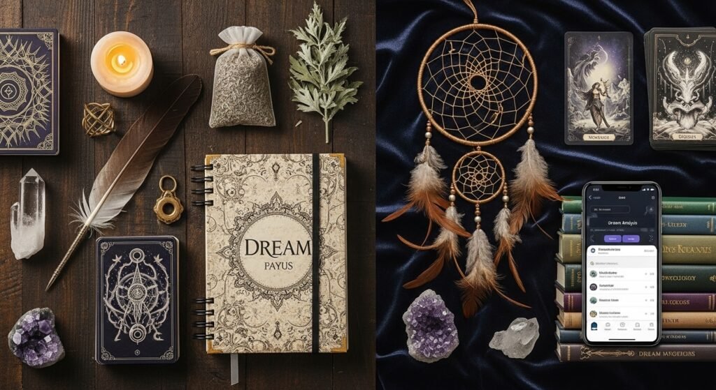 Several tools foster deeper dream exploration, including dream journals, guided meditation audio, tarot and oracle cards for symbolic clarification, and creative art supplies for symbolic expression.