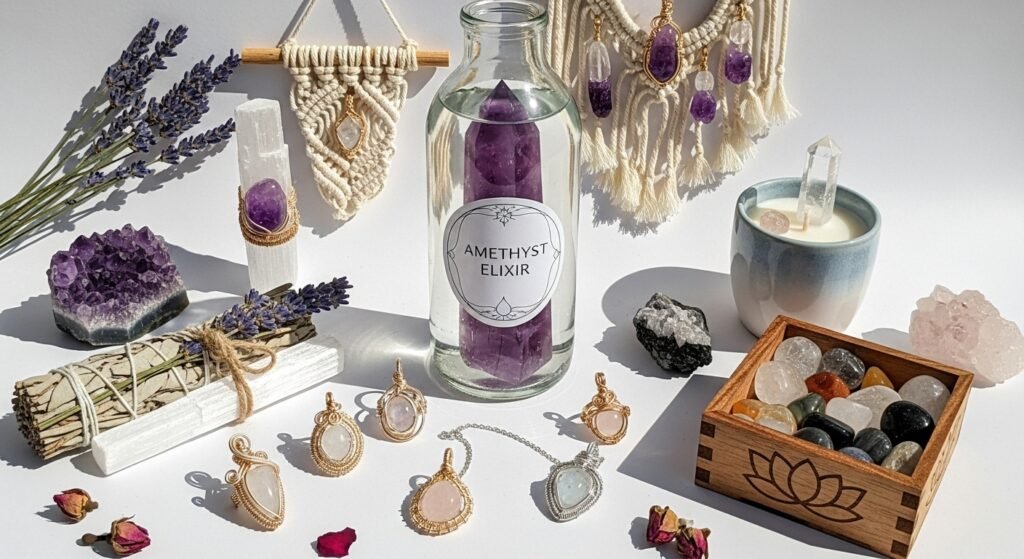| Crystals | Healing, calming, loving | Jewelry, resin art | Cleanse regularly, charge |